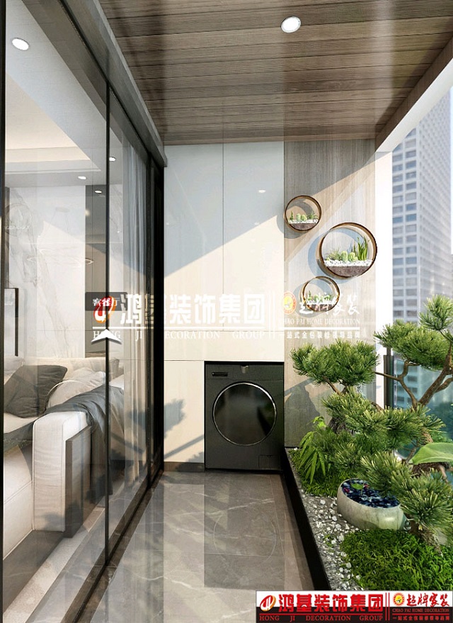圖4.亮點(diǎn):陽(yáng)臺(tái)西側(cè)滾筒洗衣機(jī)和儲(chǔ)物柜的結(jié)合設(shè)計(jì),充分利用空間。衛(wèi)生打掃更加方便,不留死角。 東側(cè)留有更多的空間可以培養(yǎng)綠植及休閑,給陽(yáng)臺(tái)空間增添生機(jī)。
