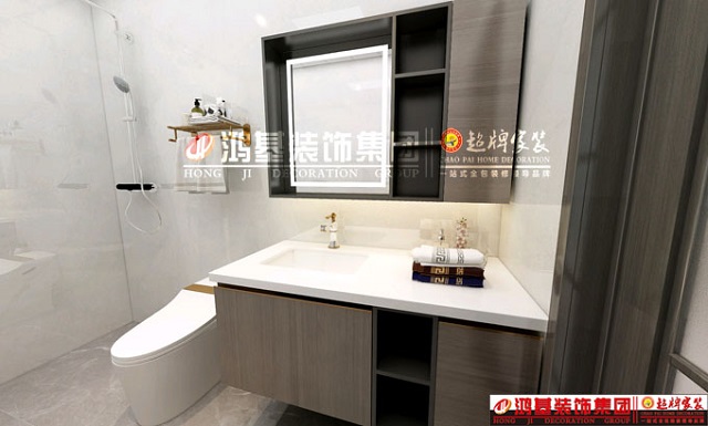 圖8.亮點(diǎn):衛(wèi)生間浴室柜采用灰木紋面板定制,與全房柜體相互呼應(yīng),避免色系過(guò)多而造成視覺(jué)疲勞。